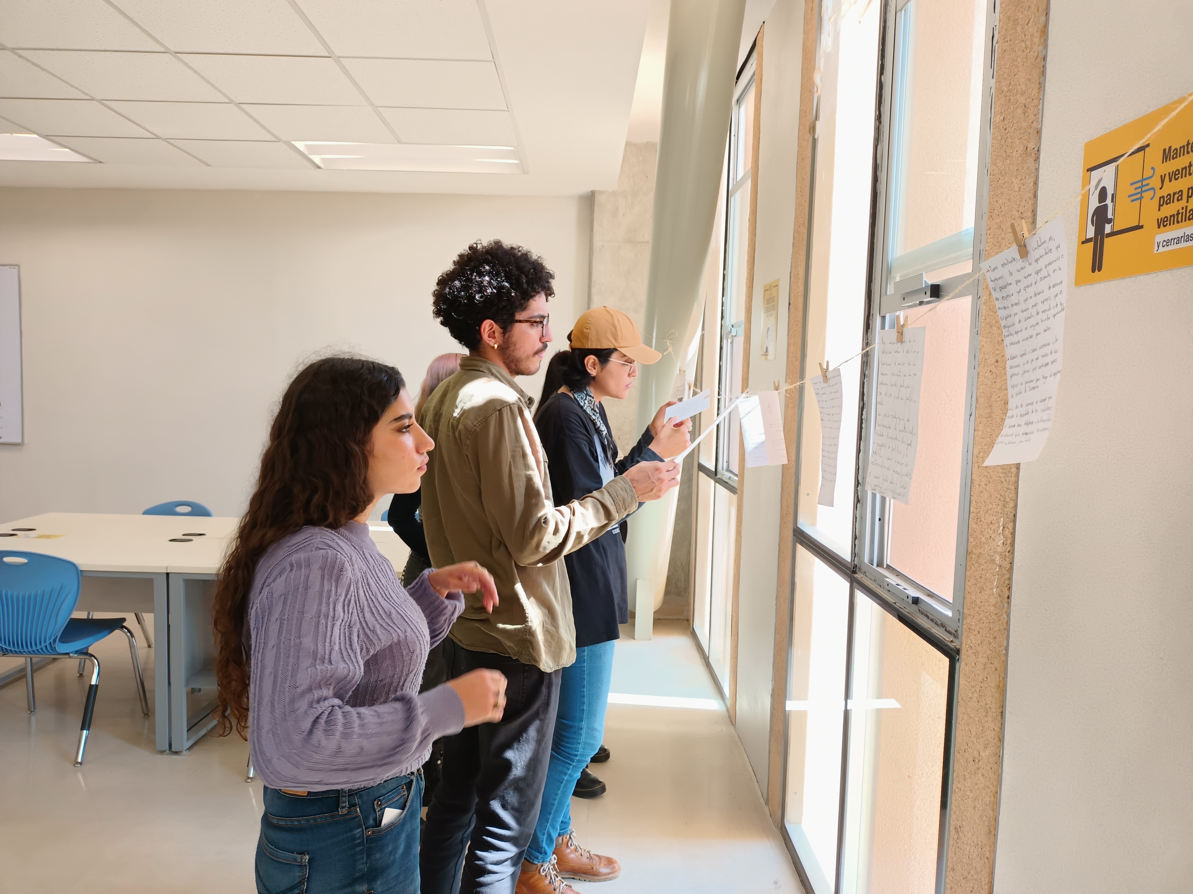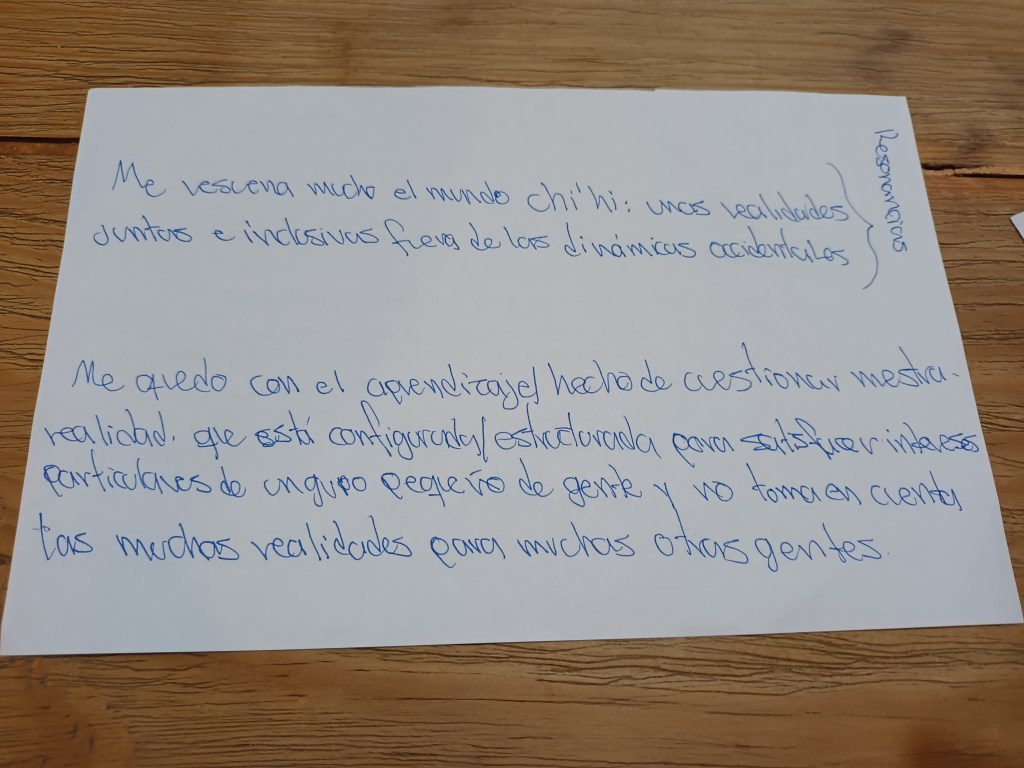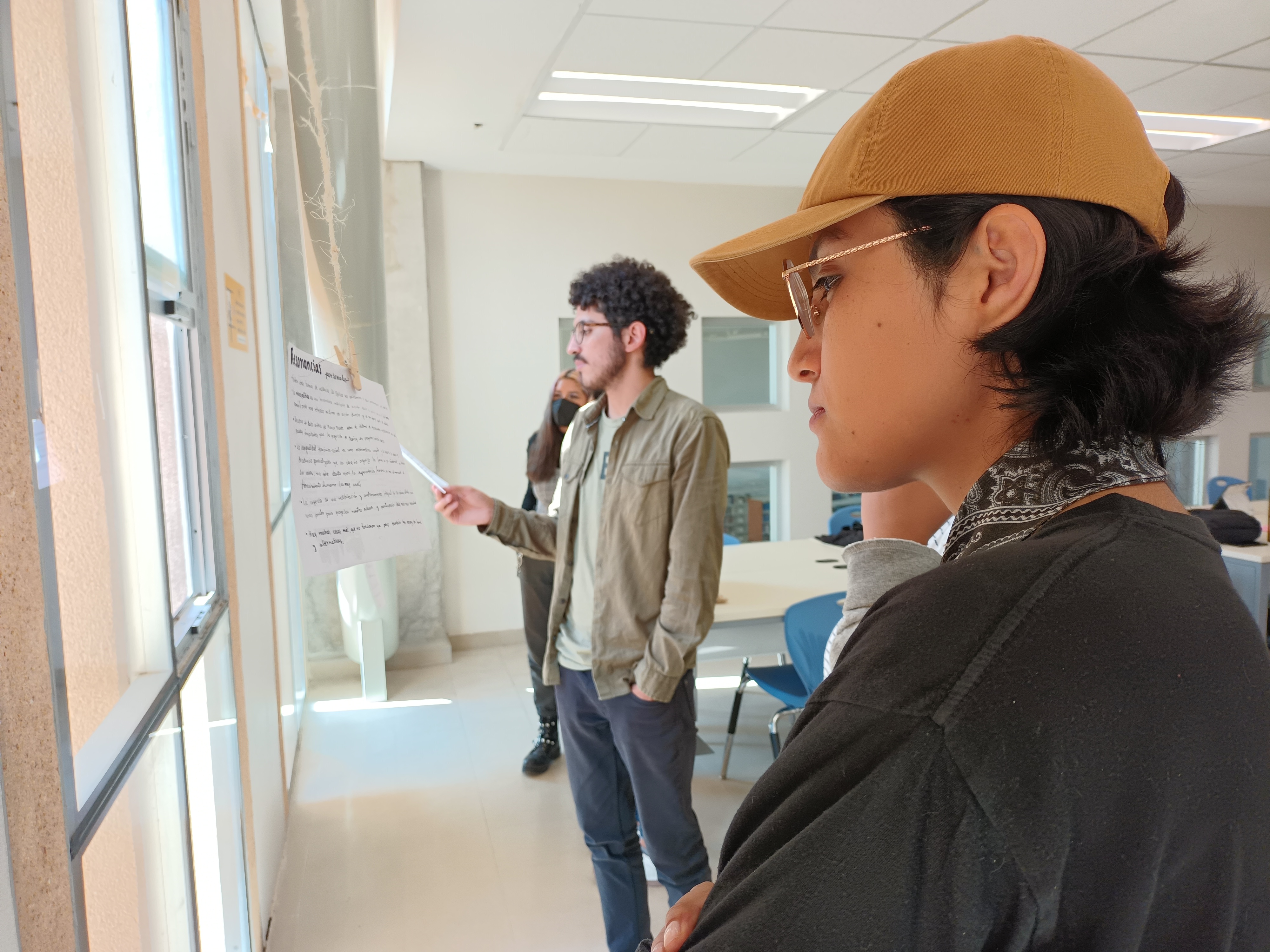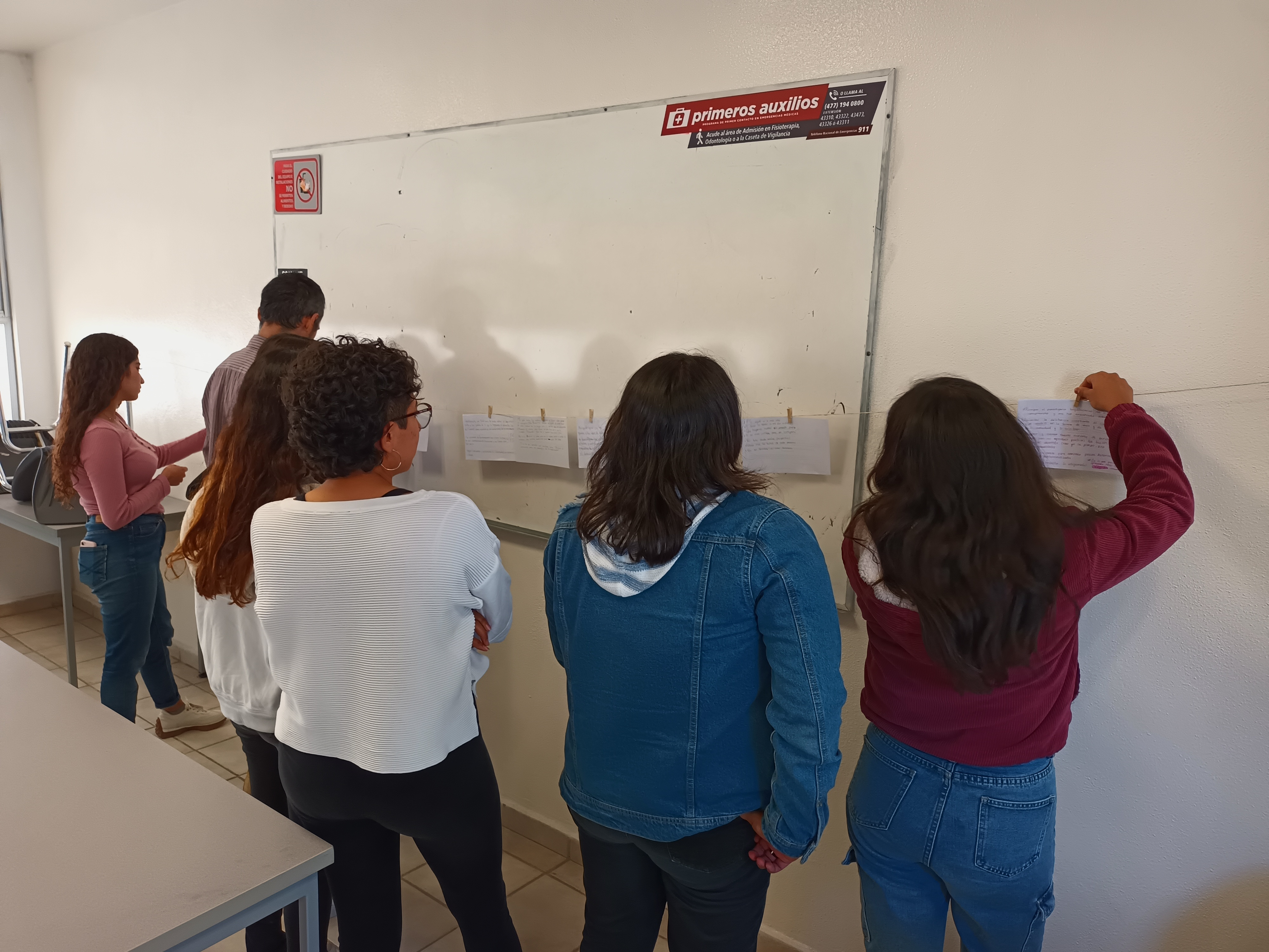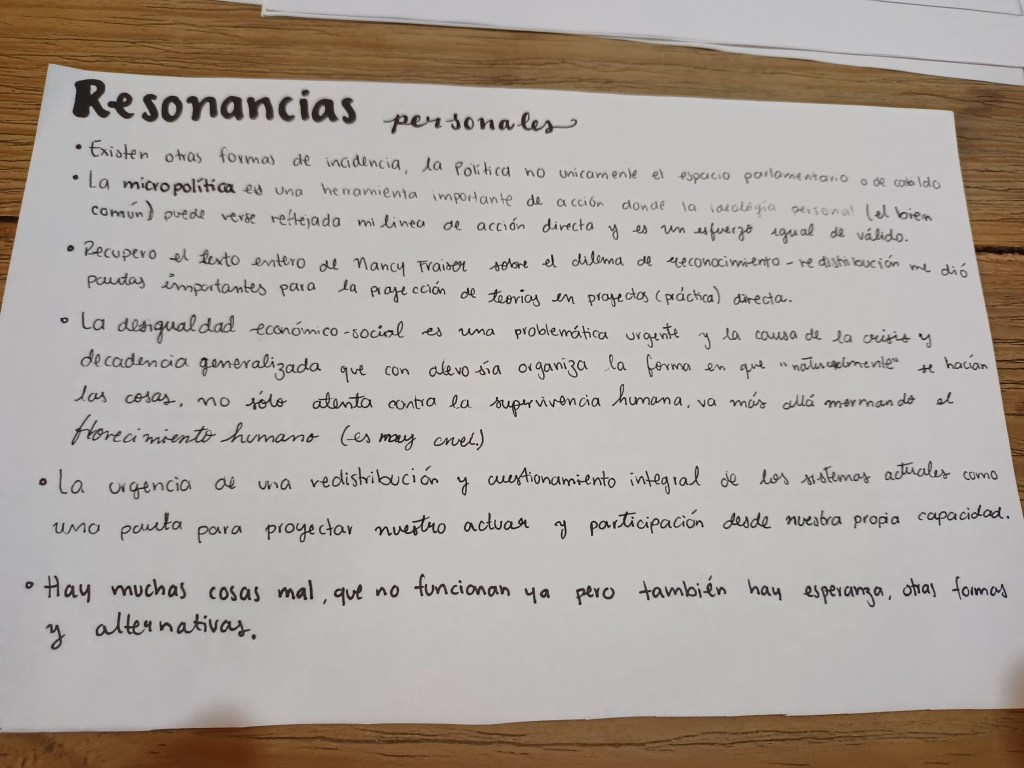 Una vez escritas las resonancias, la indicación fue colgarlas en el tendedero y esperar a que todxs lxs compañer@s colocaran las suyas. No había cronómetro. Esperamos pacientemente a que cada quien terminara de escribir. Hubo quienes tomaron más hojas y escribieron más.