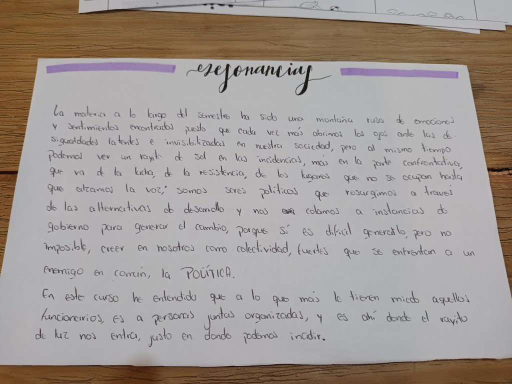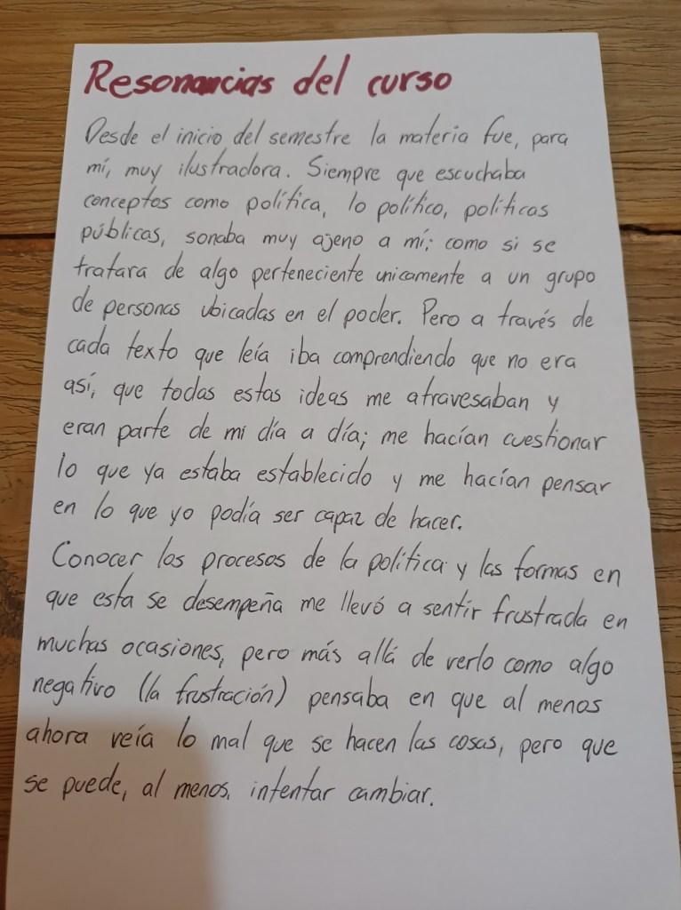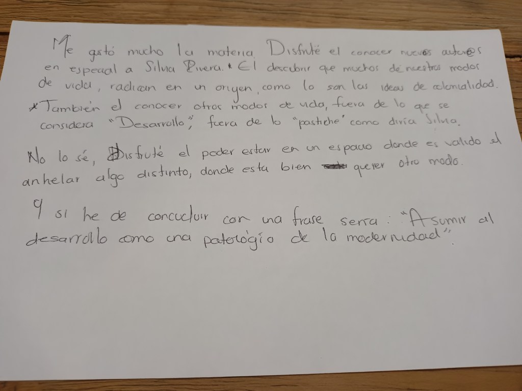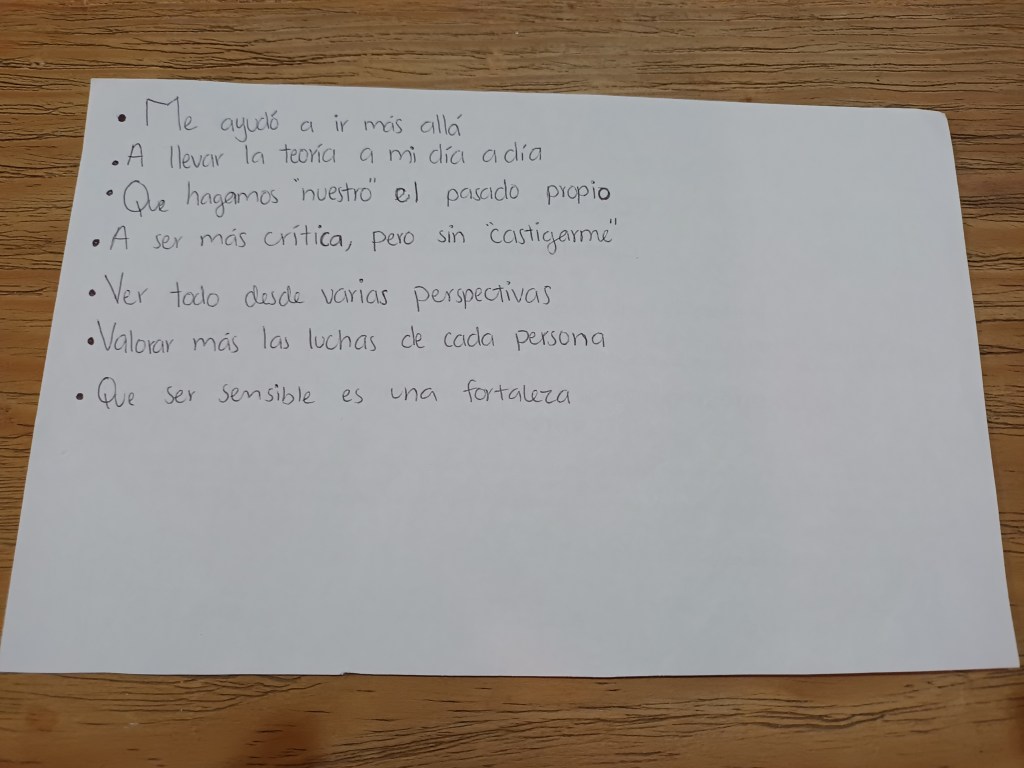 La primera pauta para les estudiantes fue tomar una hoja en blanco (cortadas por mitad) y darse el tiempo necesario para pensar las siguientes preguntas como incentivo para la redacción: ¿Qué resonancias les quedaron de la materia? ¿Qué aprendizajes significativos tuvieron? ¿Cómo la materia les ayudó a comprender de otras formas el mundo que les rodea? ¿Qué sombras iluminó el curso para ustedes? ¿Qué emociones les atravesaron?