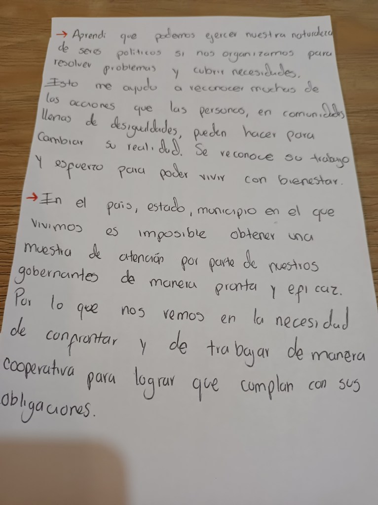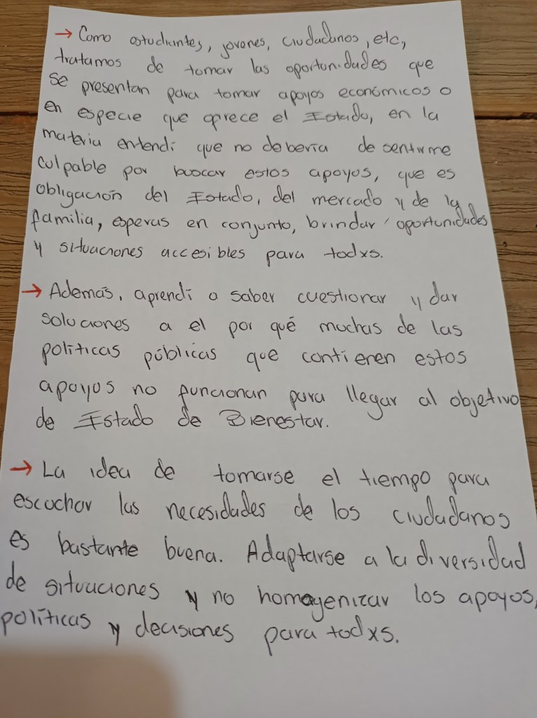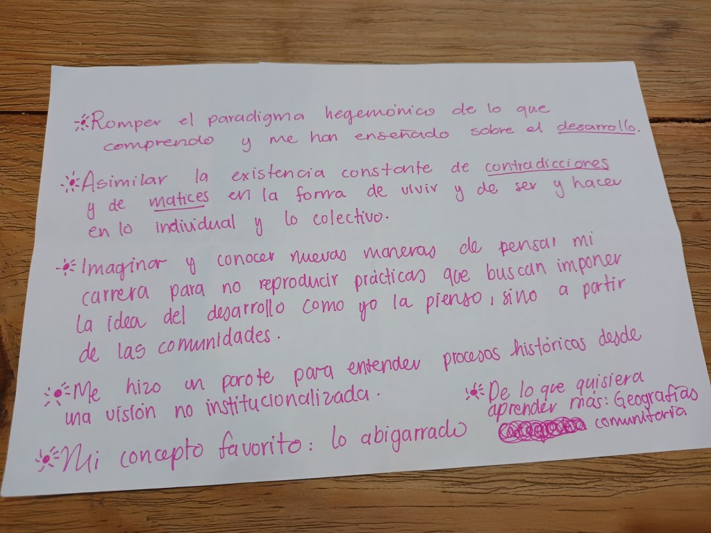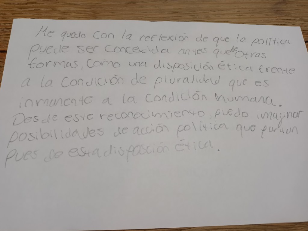 La primera pauta para les estudiantes fue tomar una hoja en blanco (cortadas por mitad) y darse el tiempo necesario para pensar las siguientes preguntas como incentivo para la redacción: ¿Qué resonancias les quedaron de la materia? ¿Qué aprendizajes significativos tuvieron? ¿Cómo la materia les ayudó a comprender de otras formas el mundo que les rodea? ¿Qué sombras iluminó el curso para ustedes? ¿Qué emociones les atravesaron?