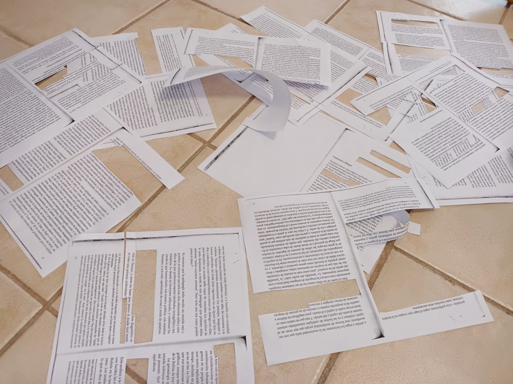 En este sentido, y luego de la lectura previa del texto, llevé un juego de copias impresas del capítulo ya mencionado a la sesión. Nos sentamos en círculo y coloqué el juego de copias sueltas al centro y en el piso. Les pedí que recortaran los fragmentos del texto que les gustaran más, que les hicieran sentido, con los que tuvieran alguna afinidad o contrariedad. Durante varios minutos, quizás una media hora, las y los educandos fueron haciendo los recortes y regresando las copias recortadas al centro. Unx a unx tomaban y regresaban los recortes y el texto original y su orden se fue descomponiendo. Un silencio generalizado invadió la dinámica. Todxs leíamos en voz baja, explorábamos el discurso de Silvia (me recuerda al Texto como Otro de Joan-Carles Mélich), dialogábamos con ella a través de su texto en busca de nuevos significados.