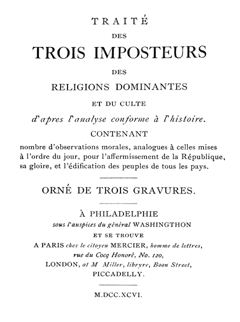 [4] García del Campo, Juan Pedro. (2006). Introducción. El tratado de los teres impostores: un panfleto libertino contra el integrismo. En Anónimo. Tratado de los tres impostores (Moisés, Jesucristo, Mahoma). Tierradenadie Ediciones.